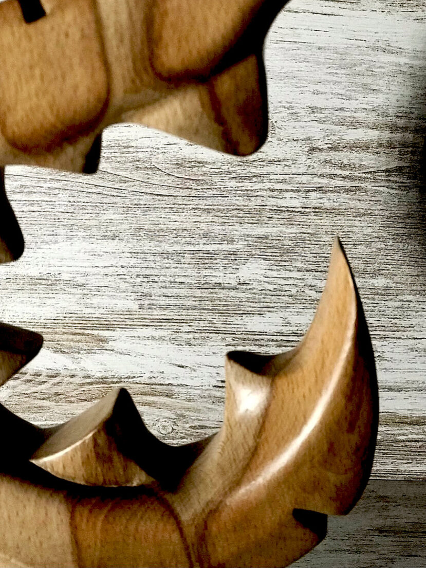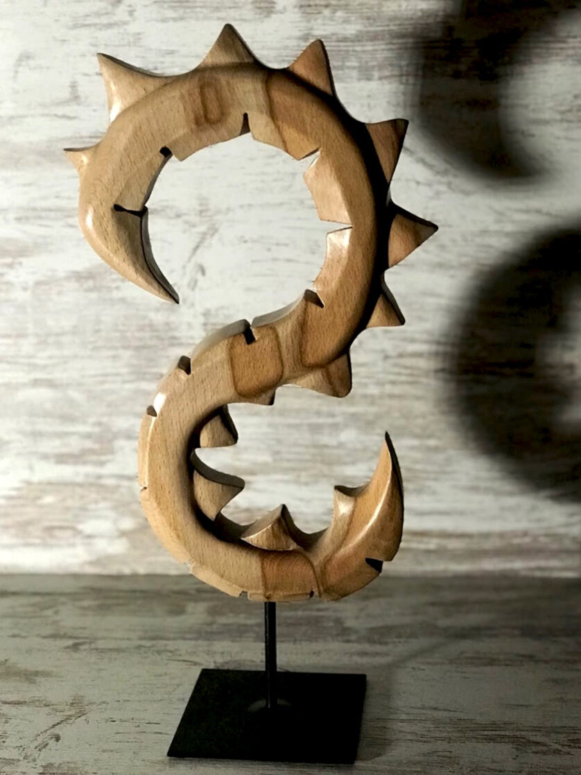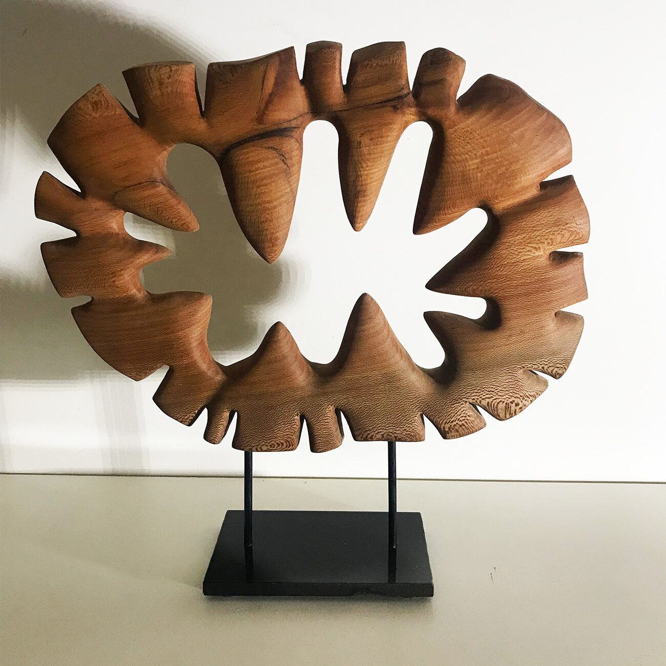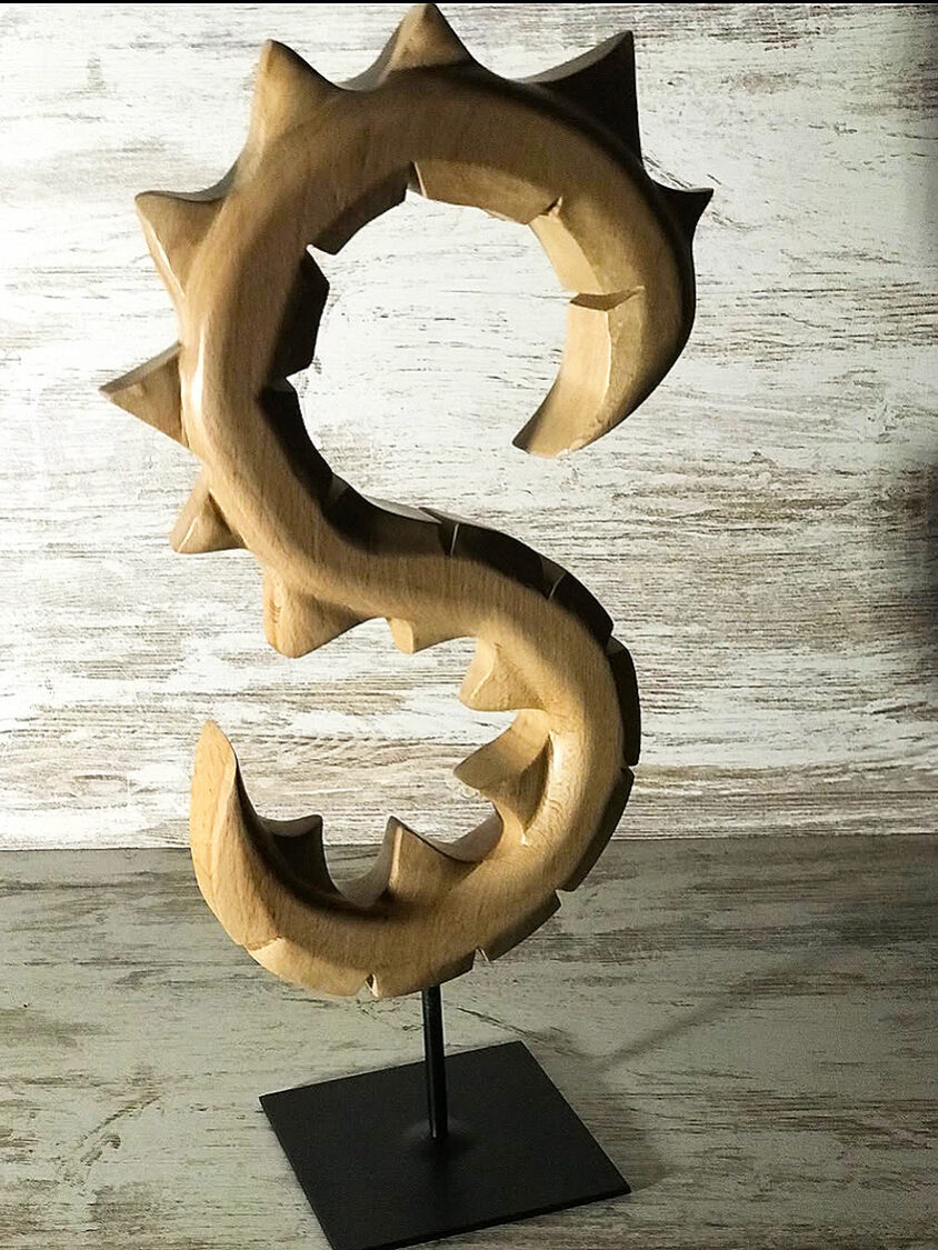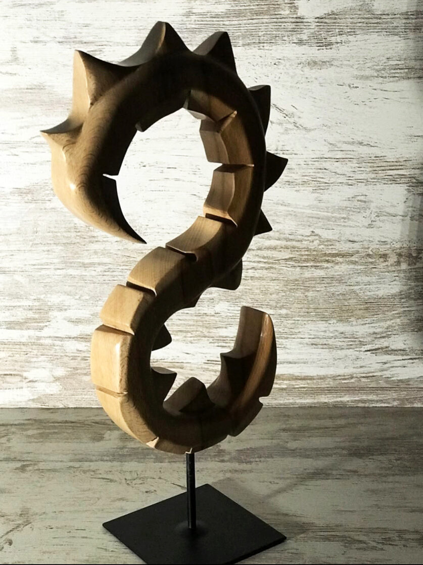 Escultura abstracta contemporánea realizada con métodos tradicionales en madera de haya, terminación a base de cera de abeja, base de acero pintada.
