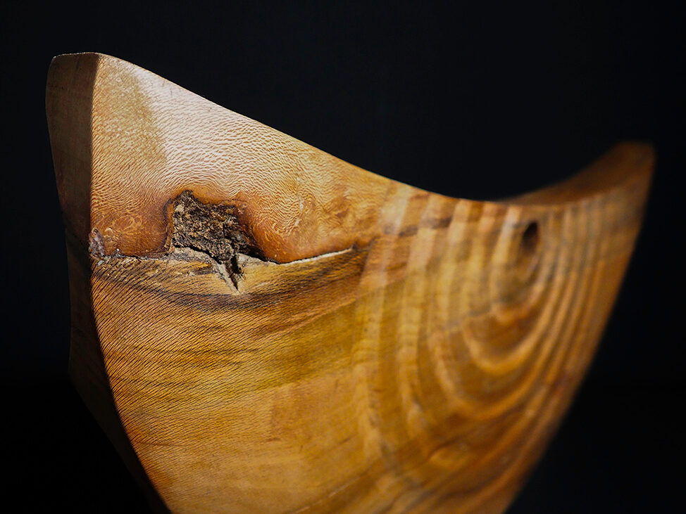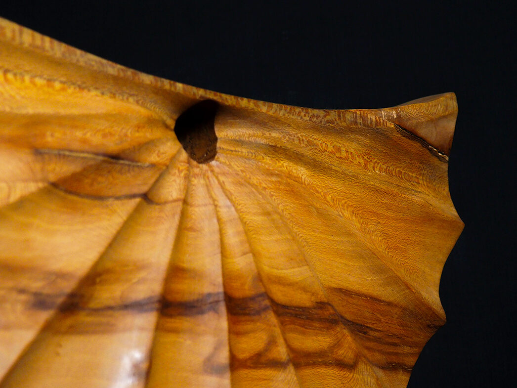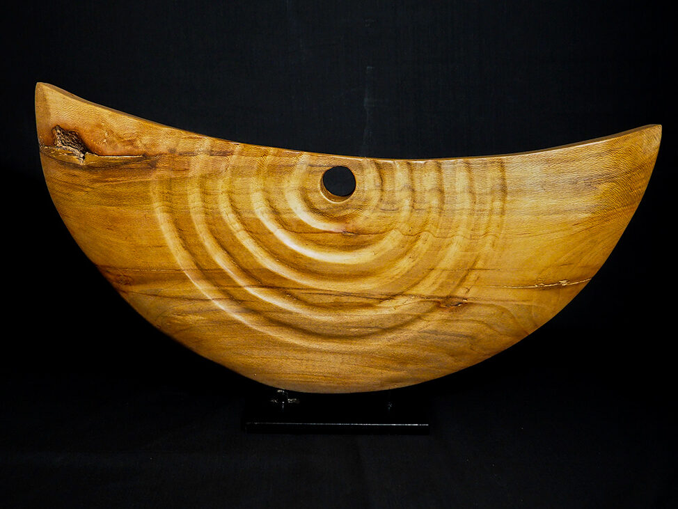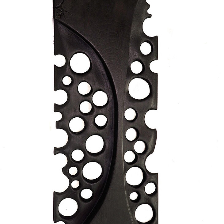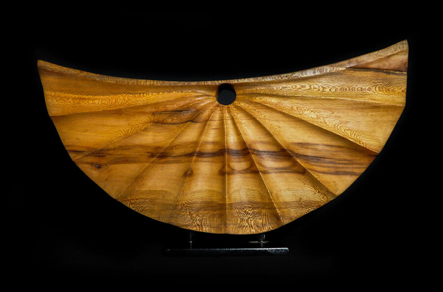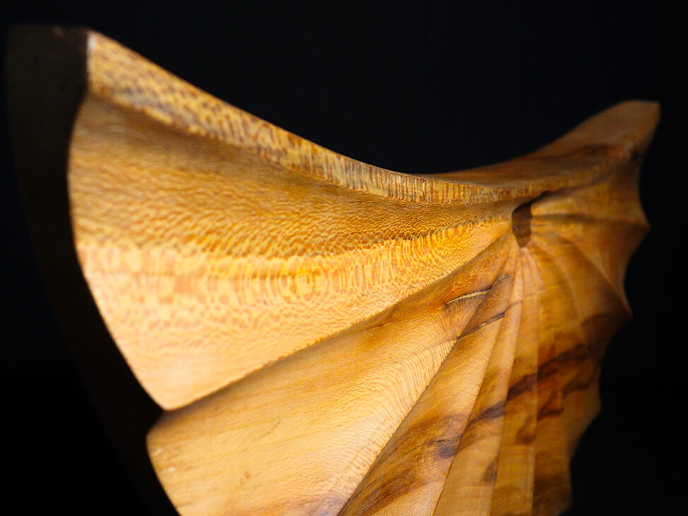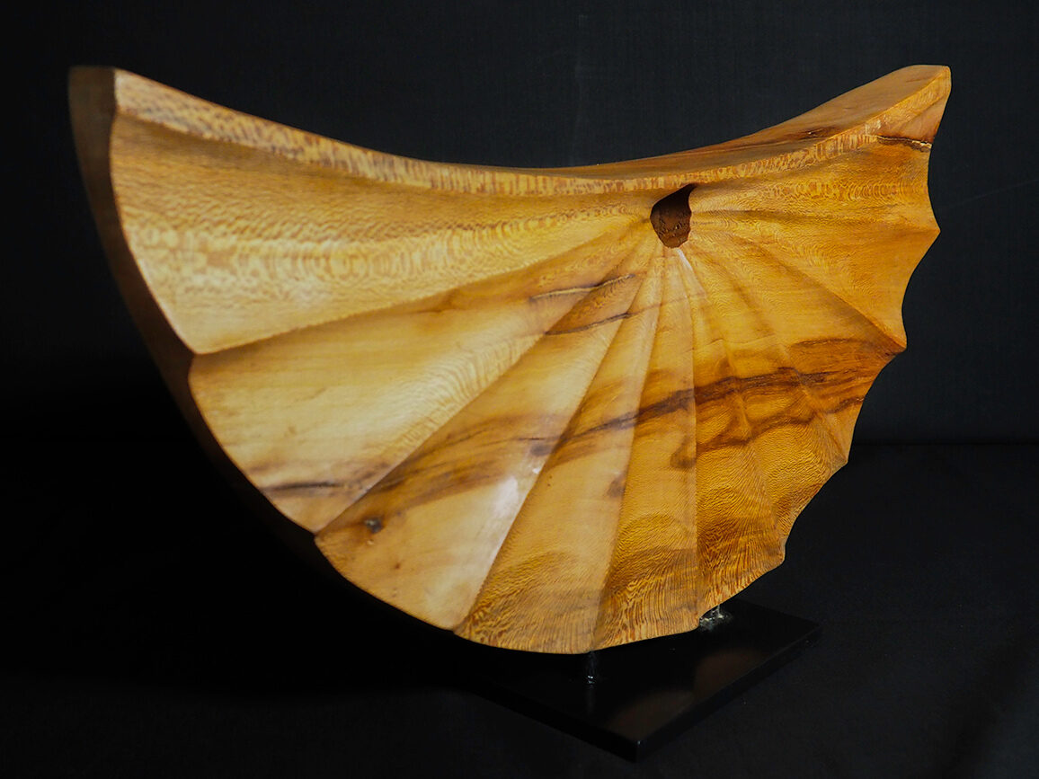 Escultura contemporánea abstracta realizada con métodos tradicionales en madera de platanero, con base de acero.